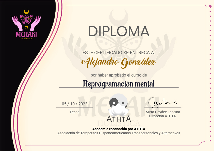 Junto con el DIPLOMA INTERNACIONAL reconocido por Athta te beneficiarás con la posibilidad de publicitarte como miembro de la Asociación de Terapeutas Hispanoamericanos Transpersonales y Alternativos.
